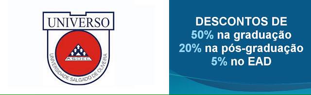 Descontos de 50% (cinquenta por cento) nas mensalidades dos cursos de graduação. Descontos de 20% (vinte por cento) nas mensalidades dos cursos de pós-graduação. Descontos de 5% (cinco por cento) nas mensalidades dos cursos EAD. Avenida Mal. Mascarenhas de Morais nº 2169, Imbiribeira, Recife-PE. Telefone: 37979026. www.universo.edu.br