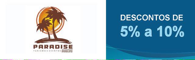 Descontos de 5% (cinco por cento) a 10% (dez por cento) nos pacotes turísticos. Avenida Barreto de Meneses nº 809, Loja 04, Piedade, Jaboatão dos Guararapes-PE. Telefone: 30792430. www.viagensparadise.com